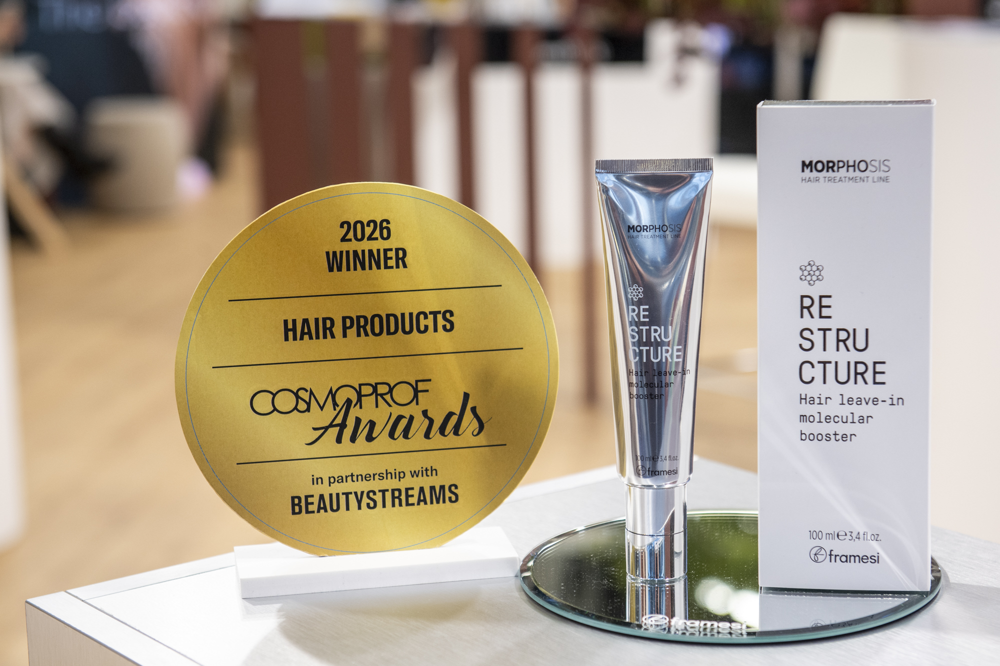 biomimetic peptides strengthens and regenerates hair from root to tip, setting a new standard for resilience and vitality. The innovation was recognized on the global stage, winning best Hair Product in the Cosmoprof Awards 2026, and featured prominently in booth activations, including a highly engaged giveaway moment.