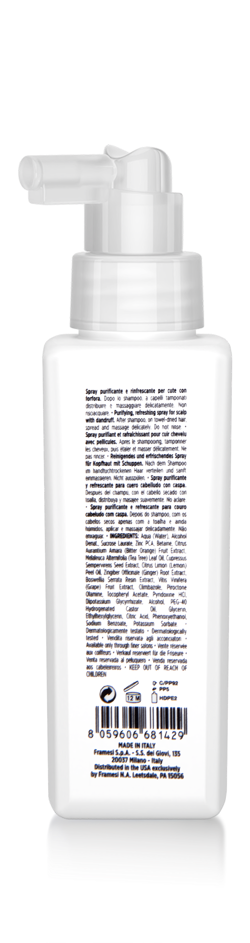 A purifying and refreshing spray that combats dandruff and soothes itchy and sensitive scalps. Including Chinotto extract, Tea Tree Essential Oils, specific anti-dandruff, Piroctone Olamine, and Climbazole, which clarifies the scalp and leaves it fresh and rejuvenated between shampoos.