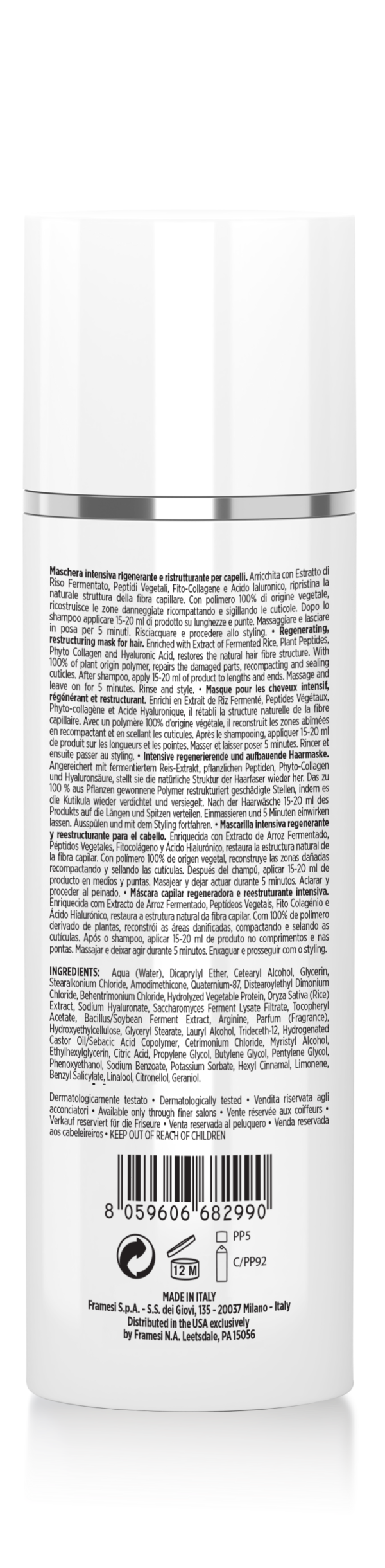 Intensive regenerating and restructuring hair mask. Enriched with Fermented Rice Extract, Vegetable Peptides, Phyto-Collagen, and Hyaluronic Acid, it restores the natural structure of the hair fiber.