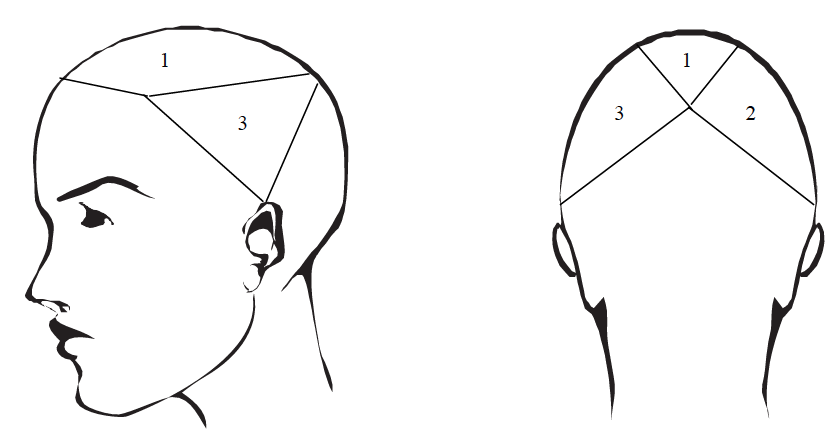Trace a diagonal line, following the hair line, from the arch of the eyebrow to the top of the ear. Then trace another diagonal line from the top of the ear to the point from section 1 at the center juncture. Repeat the above steps for section 3