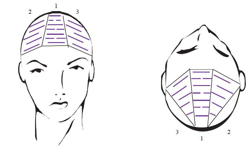 1. Starting in section 1 – begin your first STRIKE4 placement working from the front hairline back. Create your STRIKE4 placements taking ½ inch sliced partings, dropping ¼ inch in between each placement alternating in a brick laying pattern as shown in the diagram. (10 total STRIKE4 placements).